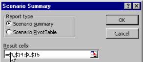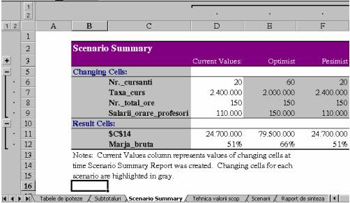 Se observa ca în zona de rezultate (Result Cells) aferenta raportului Scenario Summary, celula ce contine Rezultatul nu a fost în prealabil numita si de aceea ea apare indentificata în raportul de sinteza prin coordonatele sale.
