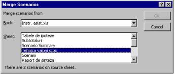 Caseta de dialog Merge Scenarious (fig. 1.169) permite identificarea scenariilor în mai multe documente Excel (rubrica Book:) si în mai multe foi de calcul, prin lista rubricii Sheet. De exemplu în fisierul "Instrumente de asistare a deciziei.XLS" exista doua scenarii în foaia de calcul numita "Tehnica valorii scop".