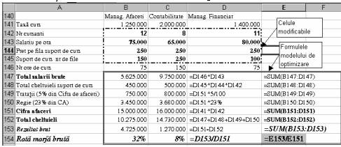 Optimizarea modelului presupune stabilirea în primul rând a obiectivului acestuia, în cazul luat este vorba de celula care contine formula rentabilitatii globale (Target Cell), adica E154 (rentabilitate globala totala = rata marjei brute / cifra de afaceri).
