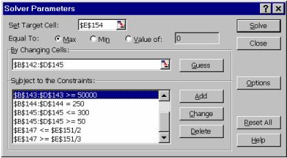 Pentru rezolvarea problemei de optimizare, în sensul maximizarii rentabilitatii (rata marjei brute), se pozitioneaza cursorul pe celula care contine obiectivul (E154) si se activeaza comanda Tools - Solver, iar în caseta de dialog Solver Parameters se stabilesc : celula obiectiv, sensul optimizarii, celulele modificabile sau ajustabile (prezentate în figura anterioara: B143:D145) si restrictiile impuse modelului.