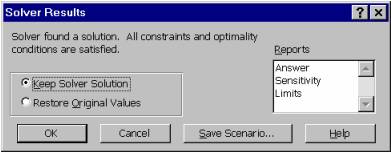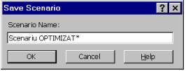 Rezultatul optimizarii presupune sau înlocuirea vechilor parametrii cu altii noi, gasiti în procesul de optimizare, implicit transformarea solutiei existente într-una noua (Keep Solver Solution), sau restaurarea parametrilor originali si pastrarea vechiului rezultat (Restore Original Values). Solutia gasita se poate salva într-un scenariu (alaturi de cele existente), apasând butonul Save Scenario.fig. 1.174