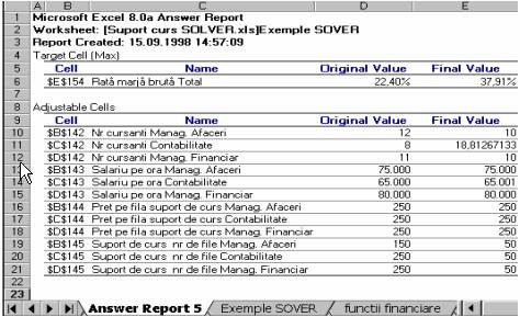 -raport tip "Sensitivity": furnizeaza informatii asupra sensibilitatii si elasticitatii modelului de optimizare, adica variatia solutiei fata de cele mai mici modificari aduse formulei din zona Set Target Cell. Altfel spus, cu cât se modifica solutia la schimbarea cu o unitate a parametrilor ce conduc la obiectivul fixat.