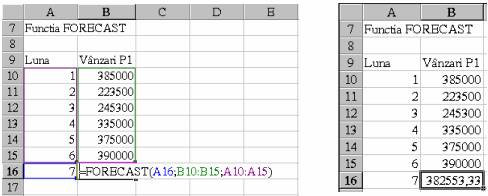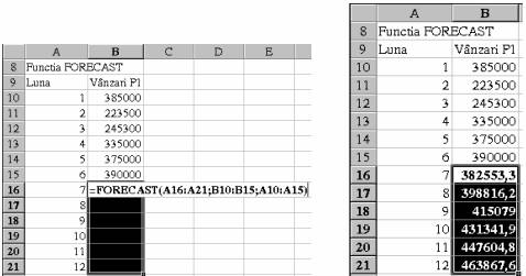 Daca s-ar fi dorit previzionarea vânzarilor pentru urmatoarele 6 luni, formula FORECAST ar fi introdusa matriceal. Recopierea clasica a formulei pentru lunile urmatoare (7-12) ar conduce la rezultate eronate.
