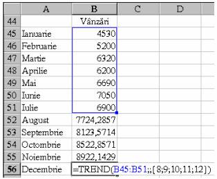câmpul care contine valorile existente pentru care se construieste prognoza; numere distincte aferente pozitiei elementelor pentru valorile prognozateDe exemplu, pentru previzionarea evolutiei vânzarilor pentru perioada august-decembrie, cunoscând valorile din perioada trecuta (ianuarie - iulie), se poate introduce matriceal functia TREND cu urmatoarele argumente: