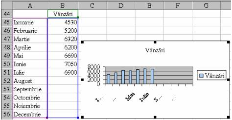 Graficul "de tendinta" se construieste în mod obisnuit, selectând seriile de date (pe linie sau pe coloana). În selectie se vor cuprinde atât datele existente (pe care se construieste prognoza), cât si câmpul care se va estima prin previziune.