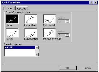 reprezentarea grafica (numai tip linear sau histograma), iar din meniul contextual Chart se alege optiunea Add Trendline (fig. 1.182).