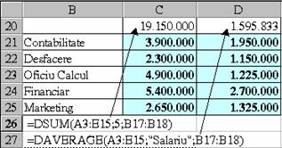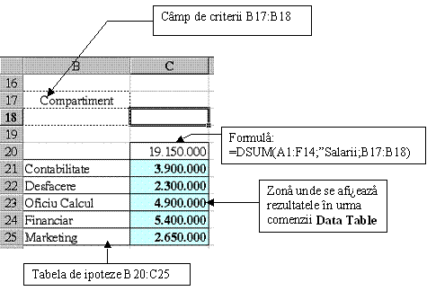 se scrie formula de calcul (=DSUM()) în col¡ul superior drept al câmpului de ipoteze- formula se va aplica pentru fiecare compartiment în parte însumând salariile pe respectivul criteriu de regrupare;
