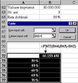 se activeazå comanda Data Table ¿i în caseta Table se completeazå adresa celulei care con¡ine criteriul în rubrica Column Input Cell- tabela de ipoteze fiind orientatå în acest caz pe coloanå ( în cazul organizårii tabelei pe linie.)