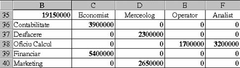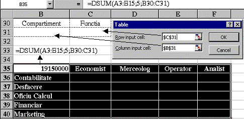 se introduce formula de însumare =SUM(A3:E15;5;B30:C31) în col¡ul superior stâng al tabelei de ipoteze (la adresa B35). Formula va genera rezultate centralizate pentru fiecare func¡ie ¿i compartiment în parte;