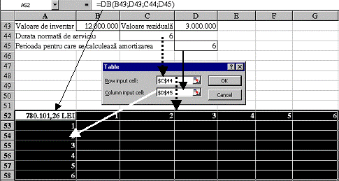 Comanda Data Table permite completarea automatå a tabloului ca ¿i cum formula sau formulele situate pe prima linie ar fi aplicate succesiv pentru fiecare valoare gåsitå în prima coloanå sau în prima linie, aceste valori reprezentånd parametrii sintetizårii informa¡iei.