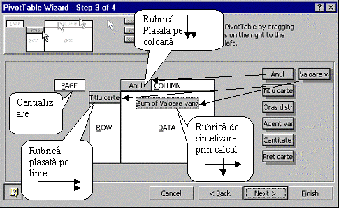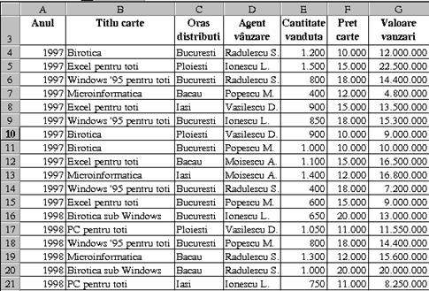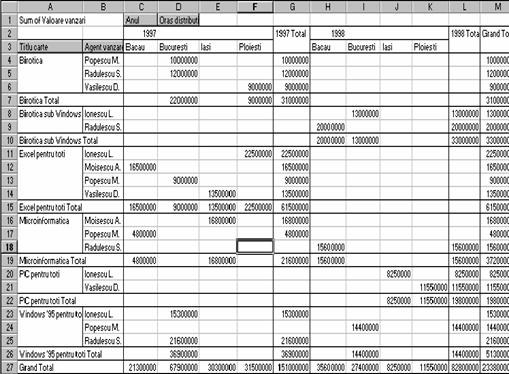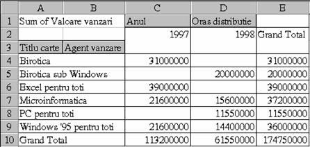Un exemplu edificator de construire ¿i utilizare a tabelei pivot ar consta în sintetizarea informa¡iei pentru o editurå, referitoare la vânzårile de carte;Fie o tabelå (figura 1.134) aferentå unei baze de date care regrupeazå informa¡ii referitoare la vânzårile de carte de informaticå pe ora¿e (Bucure¿ti, Ploie¿ti, Bacåu, Ia¿i), pe doi ani (1997/1998), pe agen¡i de vânzare (Rådulescu S, Ionescu L, Popescu M, Vasilescu D, Moisescu A.), pe cantitå¡i vândute (fiecare carte poate fi vândutå în mai multe ora¿e ¿i acela¿i agent de vânzare poate opera vânzåri pentru un titlu de carte sau mai multe, în acela¿i ora¿ sau în mai multe) ¿i pe valori reie¿ite din vânzåri. Pre¡ul cår¡ii se poate extrage (cu func¡ia VLOOKUP) dintr-un tablou de consultare verticalå. Volumul vânzårilor realizate de cåtre fiecare agent de vânzare este rezultatul înmul¡irii cantitå¡ii vândute cu pre¡ul cår¡ilor. ¥n rezolvarea aplica¡iei, asistentul tabelei pivot (prin comanda Data - Pivot Table Report) parcurge urmåtoarele patru etape (prin apåsarea butonului Next> pentru fiecare etapå în parte):