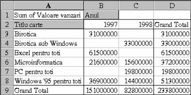 De exemplu plasând cursorul la intersec¡ia a douå rubrici, anume Ora¿ distribu¡ie = Bucure¿ti ¿i Birotica Total, rezultå în urma unui dublu-click o extragere tip bazå de date, pentru vânzårile totale de carte cu titlul "Biroticå" în Bucure¿ti (fig. 1.151).