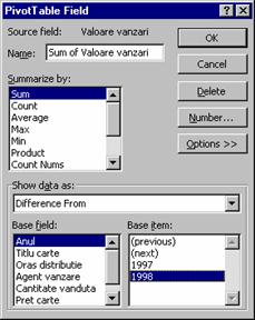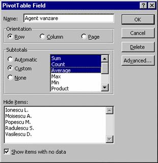 se alege tipul de opera¡ie care va aplica datelor regrupate (Sum; Max; Min; Avarage; Count; Product) din caseta Use Function;