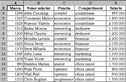 Plecând de la o bazå de date pentru eviden¡a personalului unei societå¡i comerciale, se calculeazå suma salariilor pe compartimente func¡ionale. Tabelul ce con¡ine baza de date va fi definit pe coordonatele A1:F14, figura 1.122.