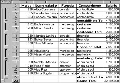 Sub Excel existå posibilitatea sintetizårii informa¡iei prin organizarea ei pe niveluri de grupare, iar apoi pot opera diferite calcule pe aceste grupuri sau informa¡ii centralizate. Altfel spus Excel poate organiza datele prin grupare pentru generarea de totaluri ¿i subtotaluri.
