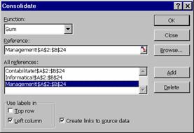 Adåugarea de noi foi de calcul de sintetizat care så participe la elaborarea unui rezultat consolidat se face prin includerea acestora în caseta Reference ¿i apåsarea butonului Add. ªtergerea unui element care participå la consolidare se face prin selectarea acestuia din lista All references ¿i apåsarea butonului Delete.
