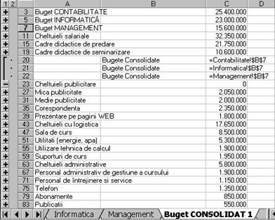 Un institut de formare dore¿te så-¿i centralizeze informa¡iile legate de bugetele de cheltuieli aferente cursurilor de instruire pe care le face. Fiecare buget de curs se gestioneazå individual de cåtre un responsabil pedagogic. Presupunem cå respectivul institut gestioneazå trei cursuri, elaborând câte un buget pentru fiecare : Contabilitate, Informaticå ¿i Management. Fiecare buget de curs are acelea¿i capitole: Cheltuieli salariale, Cheltuieli publicitare, Cheltuieli cu logistica, Cheltuieli administrative. Cele trei bugete au fost construite pe trei foi de calcul ce poartå numele fiecårui buget. Bugetele au fost ¿ablonate, în sensul marcårii elementelor de centralizat în aceea¿i ordine ¿i pe acelea¿i coordonate.