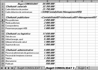 De exemplu, pentru a calcula suma salariilor cadrelor didactice de seminarizare, în celula B5 a foii de calcul de consolidare ("Buget CONSOLIDAT 2) s-a editat formula 3-D :