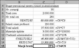 Bugetul calculeazå veniturile, cheltuileile, precum ¿i marja brutå ce se degajå din aceste cursuri. Marja brutå calculatå la un numår de 30 de cursan¡i este de 23%.