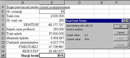 se stabile¿te ce valoare så se schimbe în rubrica By changing cell: (celula C5) - în cazul prezentat numårul de cursan¡i- pentru a se ajunge la obiectivul propus;