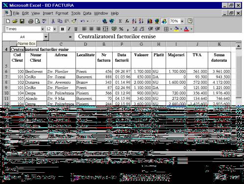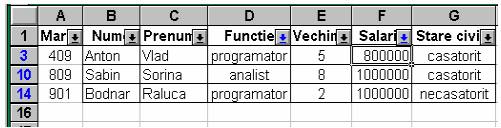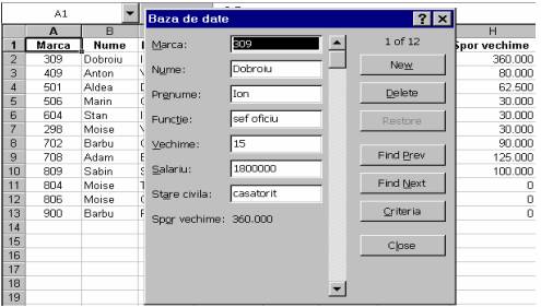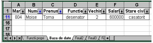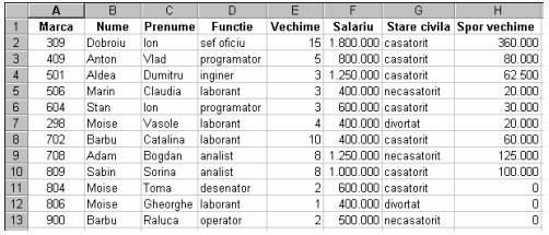 Tabelul de mai sus este desigur īn primul rānd un tabel bidimensional, īmpartit īn celule ce contin informatii despre angajatii unui oficiu de calcul. Acest tabel are toate proprietatile unei foi de calcul; asupra lui se pot efectua toate prelucrarile permise īntr-o foaie de calcul. Daca dorim īnsa sa facem prelucrari suplimentare, de exemplu cautari si extrageri de informatii dupa anumite criterii, atunci tabelul va trebui sa aibe forma unei liste. Īn acest caz tabelul va fi interpretat ca fiind o baza de date si avānd toate proprietatile ce decurg din aceasta noua ipostaza.