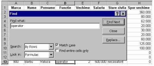 b3) se alege comanda Edit - Replace... Apare o fereastra de dialog care ne invita sa precizam valoarea cautata īn vederea modificarii (pozitia Find), precum si noua valoare (pozitia Replace). Presupunānd ca doar operatorii au salariul de 400.000 lei, atunci actualizarea se poate realiza astfel (conform figurii 1.99):