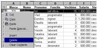se alege comanda Edit; Delete... sau se actioneaza tasta < Del> sau conform figurii 1.100 se selecteaza antetul de linie corespunzator īnregistrarii de sters si se actioneaza butonul drept al mouse-lui, iar din meniul contextual astfel generat se alege comanda Delete.
