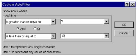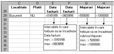 Pentru a se construi criterii ce sa raspunda la astfel de interogari īntre doua intervale, rubrica (rubricile) care va contine respectivele intervale se dubleaza. Astfel, o rubrica va avea precizata o restrictie ce semnifica borna minima, iar a doua rubrica (dublata īn cāmpul de criterii) va contine borna maxima.