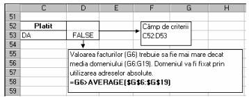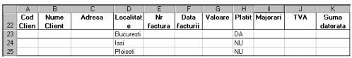 Astfel, daca s-ar dori selectarea clientilor platitori (Platit=DA), care au achitat valoarea facturilor peste media valorica a acestoara, s-ar introduce o formula ce calcul a mediei pentru rubrica Valoare factura.