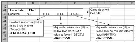 o linie (sub titlurile rubricilor) pentru precizarea restrictiilor legate prin operatorul logic « sI », si o linie pentru precizarea operatorului logic « SAU ». O interogare bazata pe un astfel de cāmp de criterii ar avea urmatorul enunt : « care sunt clientii neplatitori din Bucuresti sau Ploiesti care au majorari de īntārziere la plata facturilor de peste 1.000.000 lei ».