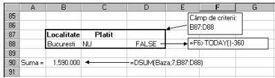 De exemplu, daca s-ar calcula suma facturilor neachitare de clientii din Bucuresti pe ultimul an, formula DSUM ar avea ca ultim argument, un cāmp de criterii definit pe coordonatele B87 :D88.