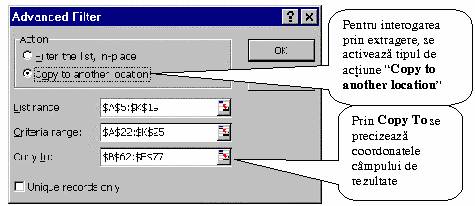 Īn cazul īn care a fost definita o zona de extragere atunci utilizatorul va completa caseta de dialog Advanced Filter (figura urmatoare) si cu coordonatele absolute ale acestei zone (īn caseta de text Copy to).