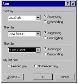 Daca se doreste ordonarea doar dupa un cāmp, va fi completata doar prima caseta de text, restul ramānānd goale. Operatiunea de sortare īncepe prin selectarea bazei de date sau prin pozitionarea cursorului pe prima celula din baza, continua prin activarea comenzii Data - Sort si definirea cheilor de sortare concomitent cu precizarea ordinii īn care se va face operatia de sortare si se īncheie prin validarea operatiei cu butonul OK.