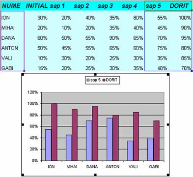 Obs. 1 Daca datele care urmeaza a fi lipite nu sunt pe aceeasi foaie de calcul cu diagrama, tine apasata tasta Alt si trage-le peste eticheta foii ce contine diagrama. Dupa ce apare foaia de calcul destinatie elibereaza tasta Alt si trage datele in foaie.