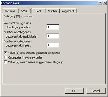Optiunile de scalare a axei categoriilor functioneaza aproximativ la fel cu cele ale axei valorilor descrise in sectiunea precedenta. Ca sa ai acces la parametrii axei X trebuie sa executi click dreapta pe axa. Din meniul rapid alege optiunea Format Axis, iar dupa ce se deschide caseta de dialog selecteaza fisa Scale.