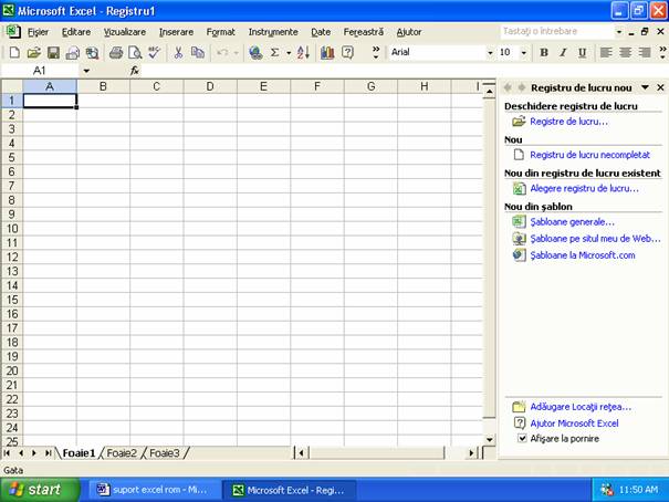 Într-o sesiune de lucru în Excel se poate crea un nou registru prin Fisier Nou se alege sablonul dorit din panoul de activitati. sablonul Registru de lucru contine numai foi de calcul goale, dar alte sabloane contin foi completate partial si cu indicatii de completare.