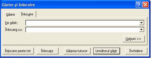 Editare Gasire sau Înlocuire se tasteaza (Fig. 10) textul cautat, cel cu care se va înlocui se selecteaza actiunea dorita (Înlocuire peste tot, Înlocuire, Urmatorul gasit,.)