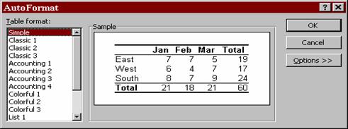 Excel are definite un numar de formate pe care utilizatorul le poate vizualiza în caseta Sample (Mostra) din fereastra de dialog Auto Format.