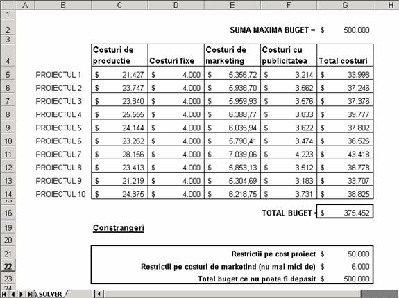 Pentru a exemplifica cum functioneaza acest instrument se va calcula costul final al unui proiect, tinând cont de mai multe variabile. Se stie ca suma maxima de buget anual este de 500.000 $, costul pentru fiecare proiect nu trebuie sa depaseasca 50.000 $ si doresti sa optimizezi sau sa aduni sumele pentru marketing si publicitate.
