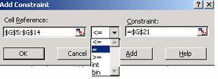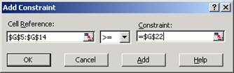 Ultima restrictie este bugetul total de 500.000$ din celula G23. Dupa ultima restrictie nu executa click pe Add ci, dupa ce ai terminat cu restrictiile, executa click pe OK pentru a reveni în caseta Solver.