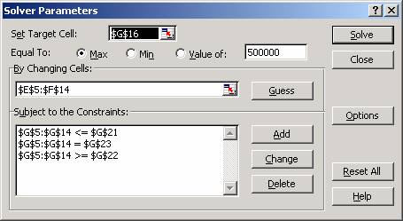 În caseta de dialog Solver Parameters (Parametri rezolvitori) stabileste parametrii pe care doresti sa-i utilizezi în problema. Pentru acest exemplu, vei dori ca în celula destinatie sa apara totalul dolarilor cheltuiti (G16), care doresti sa fie egal cu valoarea maxima a bugetului, 500.000 $ - specificata în caseta Value of (Valoarea de). Solver va calcula cea mai buna dispersie pentru obtinerea rezultatului optim, ajustând cantitatile din domeniul By Changing Cells (Celulele care se modifica) E5:F14.