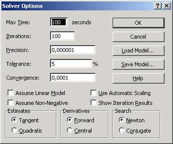 Poti modifica parametrii Solver înainte de a începe rezolvarea problemei daca banuiesti ca obtinerea problemei poate dura prea mult sau necesita prea multa putere de calcul. Executarea unui click pe butonul Options din caseta de dilaog Solver Parameters duce la afisarea casetei de dialog Solver Options în care poti stabili numarul de iteratii ale problemei ce va fi rulat de Solver în cautarea unui raspuns sau interval de timp pe care îl va petrece cautând înainte de a renunta.