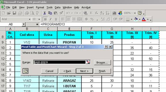 In pasul numarul 2 al aplicatiei Pivot Table Wizard selecteaza o sursa de date daca aceasta nu este selectata sau daca datele se gasesc intr-un alt registru de calcul sau domeniu decat cel prezent in caseta de dialog.
