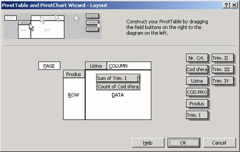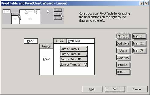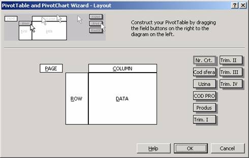 Executarea unui click pe butonul Layout din pasul 3 duce la afisarea casetei de dialog Pivot Table Wizard-Layout.