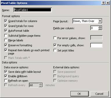 Sectiunea Data Options (Optiuni date) din caseta de dialog Pivot Table Options iti ofera cateva caracteristici utile. Lista de mai jos descrie aceste optiuni: