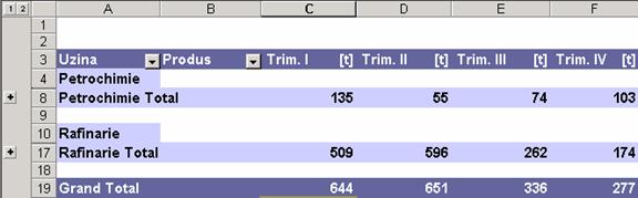 In tabelul pivot urmator toata informatia este restransa la nivelul superior, fara a se utiliza grupuri sau linii ascunse. Aceasta reprezinta elementul 3D al tabelelor pivot. Pentru a activa sau dezactiva selectii, alege un camp ce poseda un subset si executa dublu click pe campul produsului.