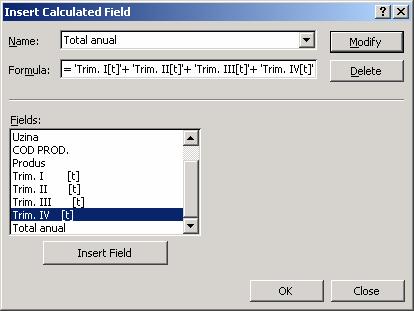 Nota: Aceste calcule le poti crea si in foaia de calcul, dupa care trebuie sa faci referire la ele in celulele din tabelul pivot. Este suficient sa ceezi o functie simpla care refera coloana si linia campului. Aceste calcule nu pot aparea in afara acestuia.