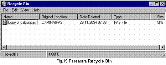 pentru a recupera fisierele sterse si a le plasa la locurile lor initiale, selectati-le. Apoi efectuati un clic pe butonul din dreapta al mouse-ului si alegeti Restore, sau alegeti File, Restore din bara de meniuri;