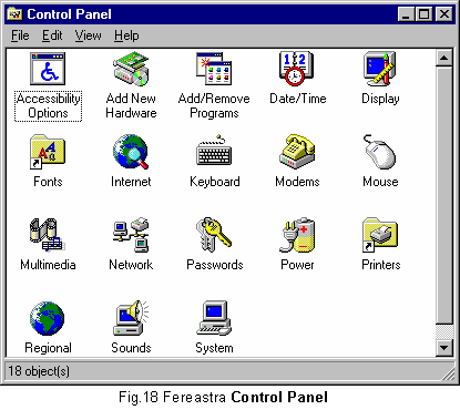Control Panel ofera, la rândul sau, numeroase metode de personalizare a sistemului Windows 98. Pentru a lansa programul selectati Start, Settings, Control Panel, sau efectuati un dublu clic pe My Computer, în desktop, apoi altul pe icon-ul Control Panel.Figura 18 arata fereastra Control Panel si numeroase icon-uri din ea. Dupa ce ati deschis fereastra Control Panel, efectuati un dublu clic pe orice icon pentru a deschide caseta de dialog sau fereastra Properties asociata ei, apoi procedati astfel: