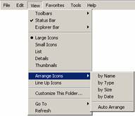 Aranjarea pictogramelor se realizeaza prin intermediul meniului View cu ajutorul optiunii Arrange Icons By. Exista cinci posibilitati de aranjare a pictogramelor intr-o fereastra: